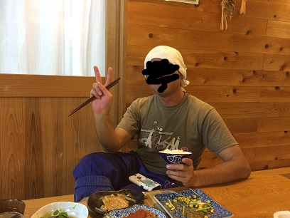 船で朝ごはんのお弁当を食べ、「の。。乗れるのか?」とビクビク
