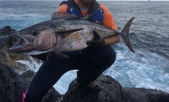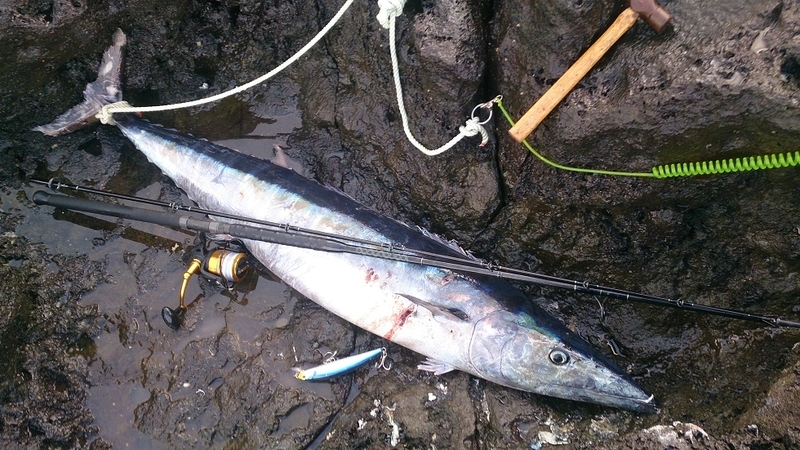 ミノーを投げ続ける友人にスマガツオがヒット。私のギャフがけ失敗しオートリリースとなる。