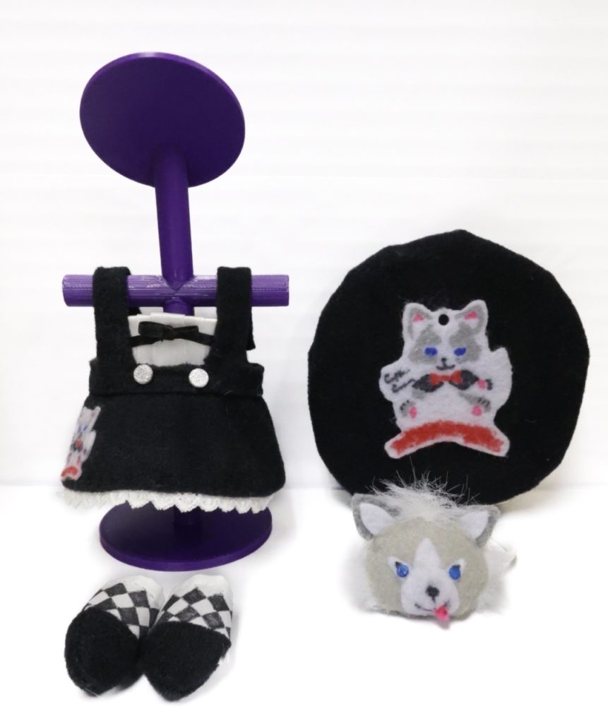 縦にヒダが入るデザインの再現に苦労したけど、ちょっとやってみたらデフォルメ感が完璧になった。胸元に黒い細いリボンでデザインリボンを縫い付け。