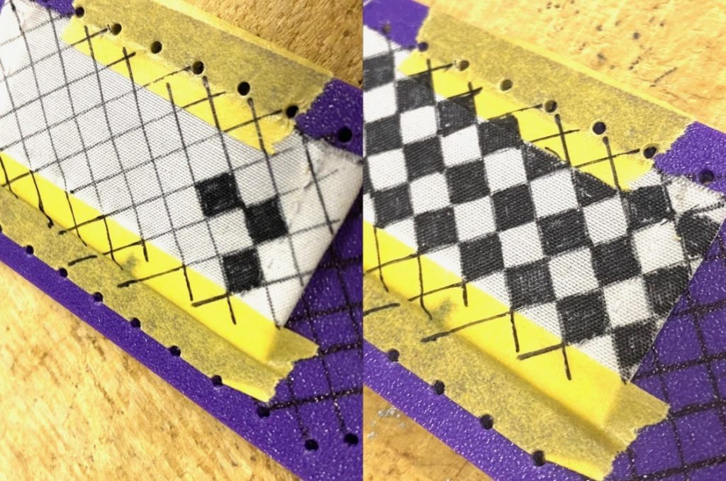 と思って作ったら難航した。まず白黒チェック生地が売ってないので自作。ダイヤ模様を刻む治具をつくってマジックで塗りつぶしていく。こういった反復作業はめんどくさい。そのままやったらマジックが滲んでしまったので、滲まない加工とかいろいろ大変だった。