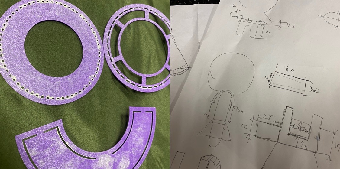 型紙は3D CADで設計して3Dプリンタで印刷。布にケガキをしてハサミでカット。
